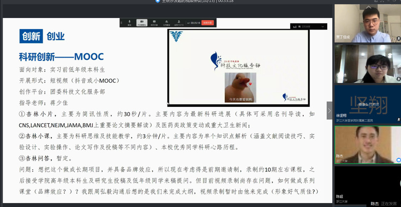 此外,杏林之星们还计划制作杏林小片、杏林小课MOOC视频,增进同学们对科研的了解。同时,他们也积极参与到浙江大学博士生报告团的云端战役计划,主动承担了对话浙医千名党员活动的多项任务。